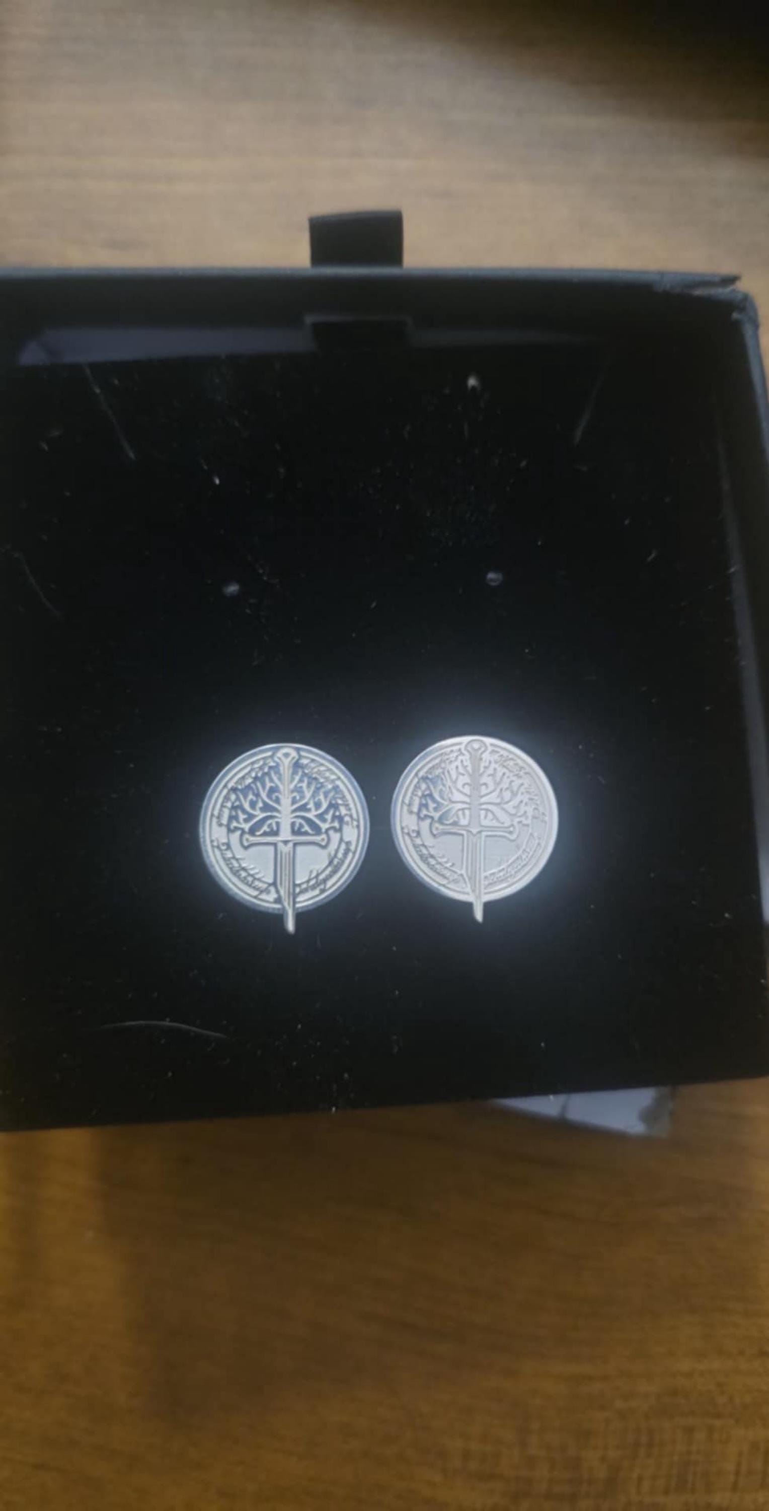 Add a touch of sophistication to your attire with these exquisite 925K silver cufflinks, featuring intricate designs inspired by Aragorn's broken sword and the iconic White Tree. Measuring 18mm in diameter, with the sword extension making the overall size 20mm, these cufflinks are perfectly sized for a refined look. The working mechanism is crafted from durable sterling steel, ensuring both elegance and reliability.