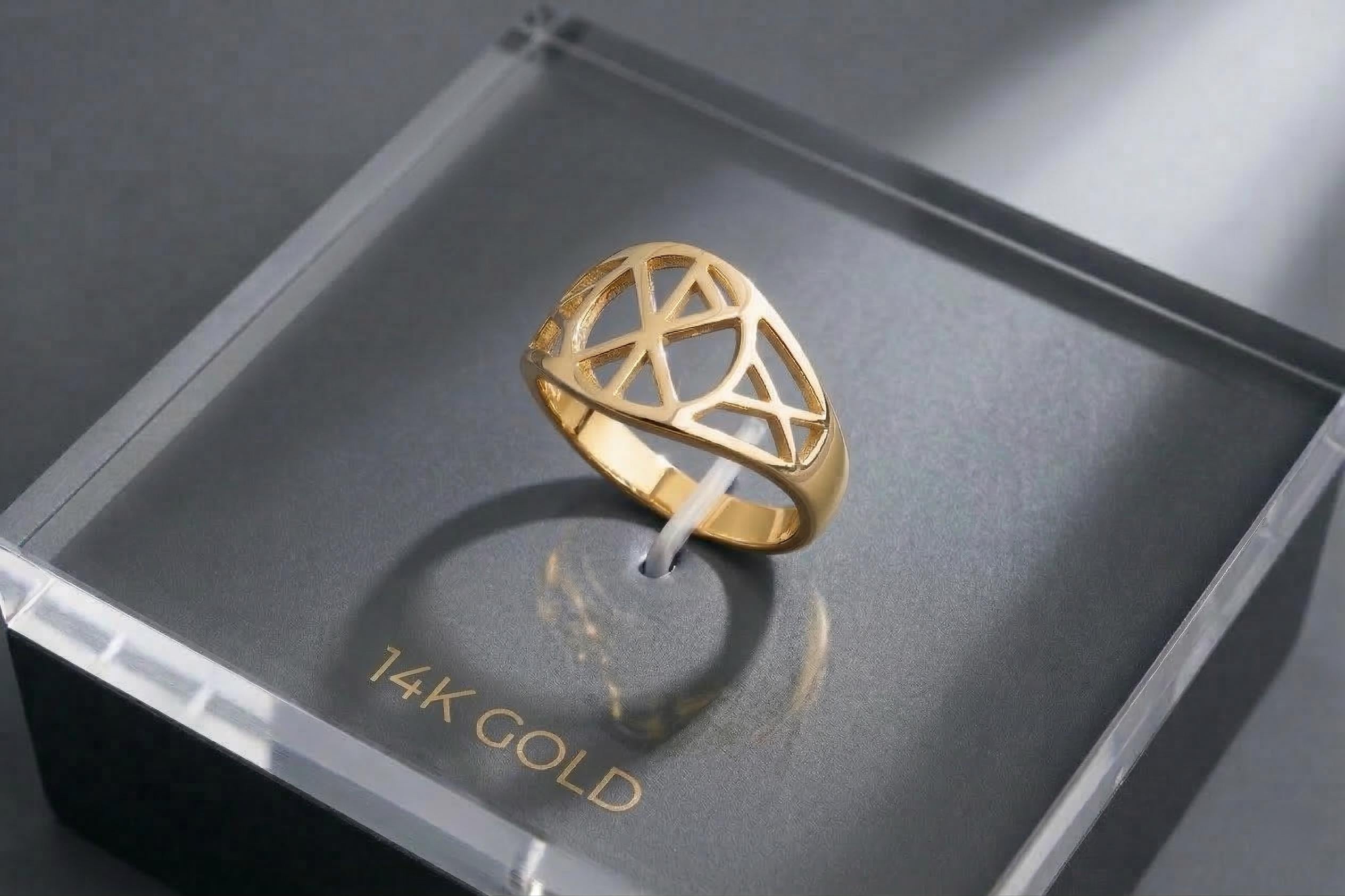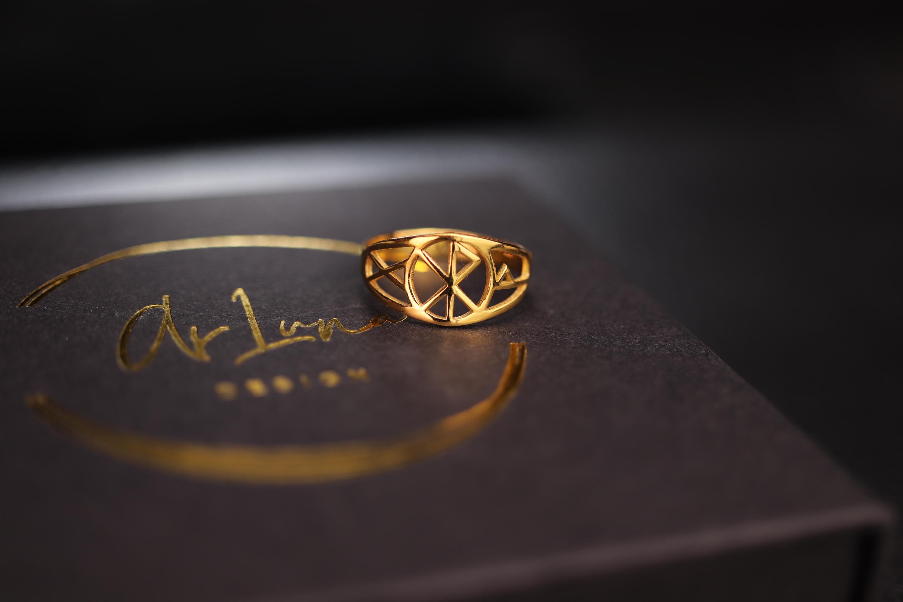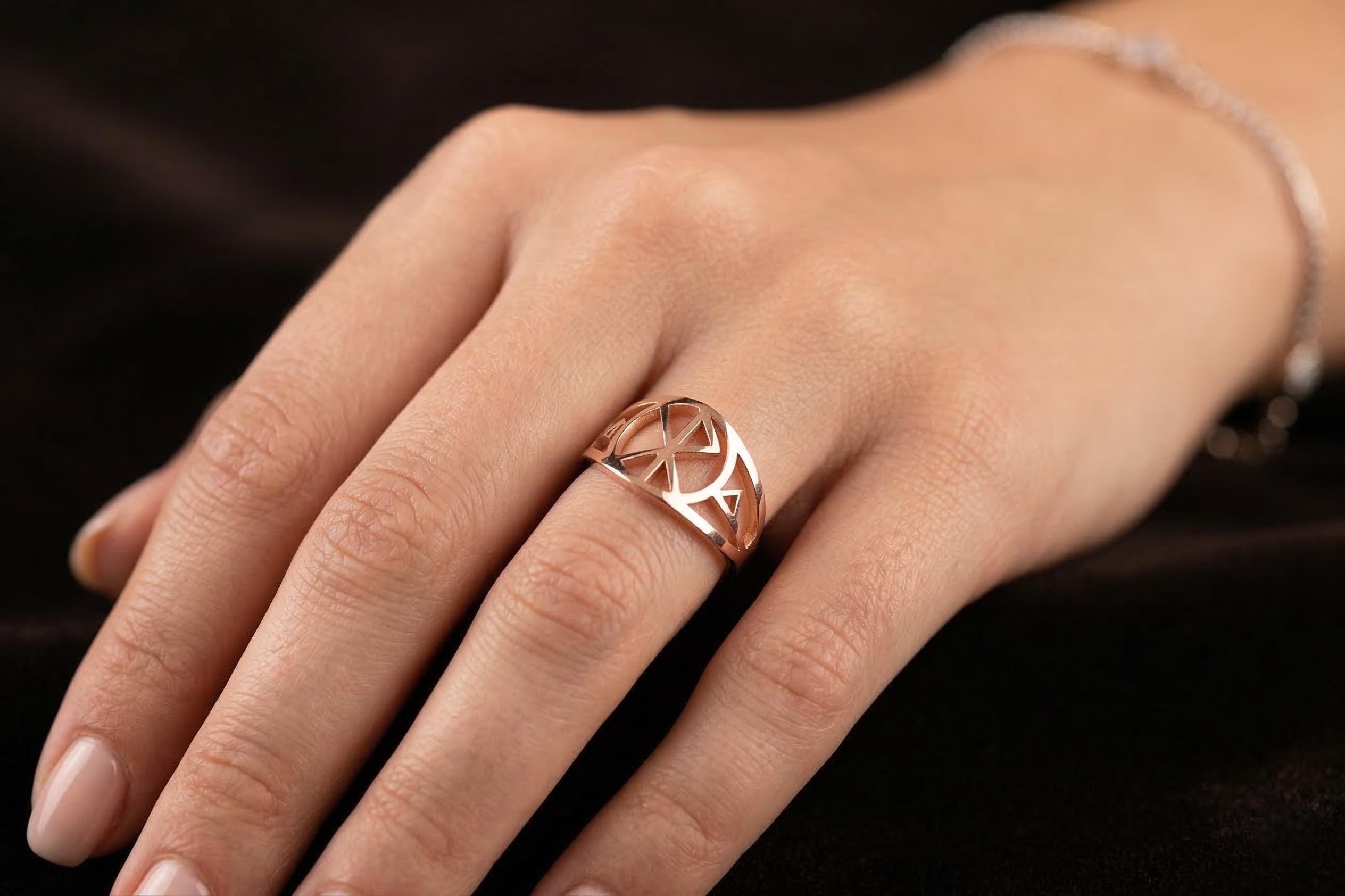 The openwork design allows light to pass through the symbol, highlighting the beauty of the gold while keeping the ring lightweight and comfortable.