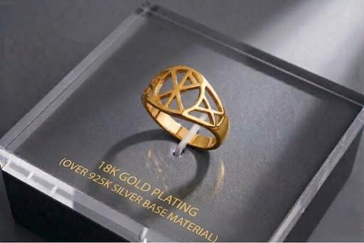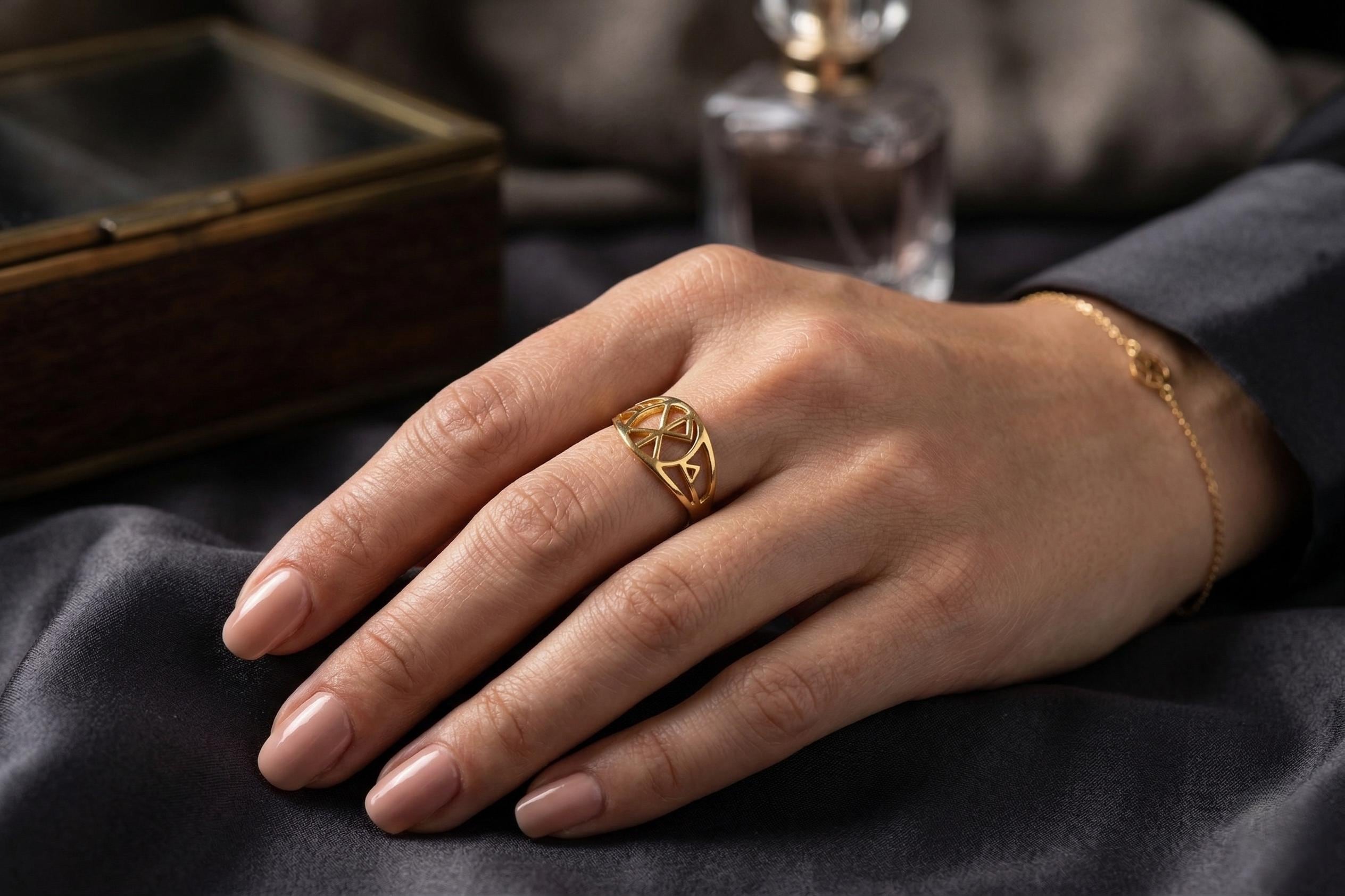 The openwork design allows light to pass through the symbol, enhancing its visual depth while keeping the ring lightweight and comfortable.